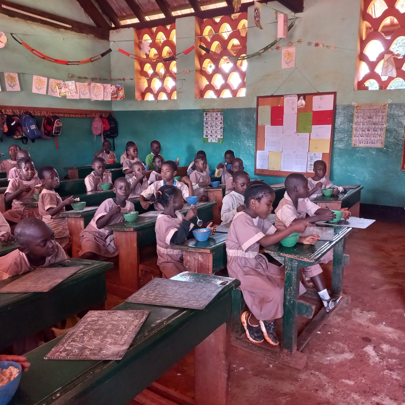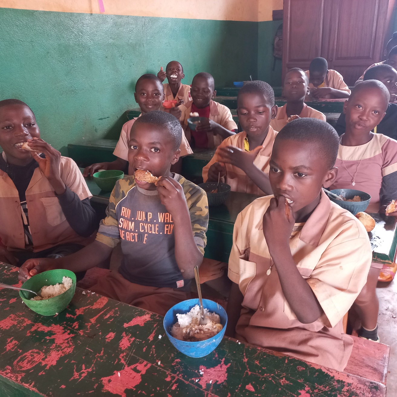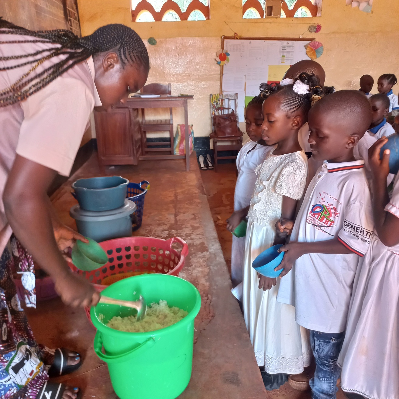 Aby zmniejszyć problem niedożywienia, chcemy kontynuować dożywianie dzieci w szkole. Wydajemy im ciepły posiłek 2 razy w tygodniu oraz 1 raz w tygodniu kaszę mannę z kukurydzy i chleb z masłem albo z czekoladą, który dzieci bardzo lubią. Niestety pogłębiający się kryzys ekonomiczny w Kamerunie sprawia, że pogarsza się też problem niedożywienia dzieci. Występuje on zarówno w porze suchej, gdy ziemia mało rodzi, jak i deszczowej, bo to pora zasiewów, więc jedzenia nie ma jeszcze na polach. Dożywianie w szkole jest wielką pomocą dla całych rodzin. Zdarza się, że dzieci ukradkiem wynoszą w kieszeniach ryż dla swojego rodzeństwa, które jest w domu. Niektóre dzieci przychodzą do szkoły właśnie dlatego, że mogą tu liczyć na coś do zjedzenia. Są one bardzo wdzięczne za ten dar. Prosimy o dalszą pomoc.