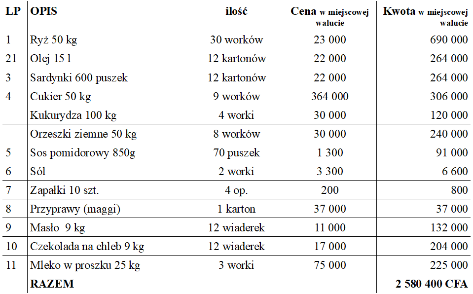 Podsumowanie w miejscowej walucie – 2 580 400 franków CFA